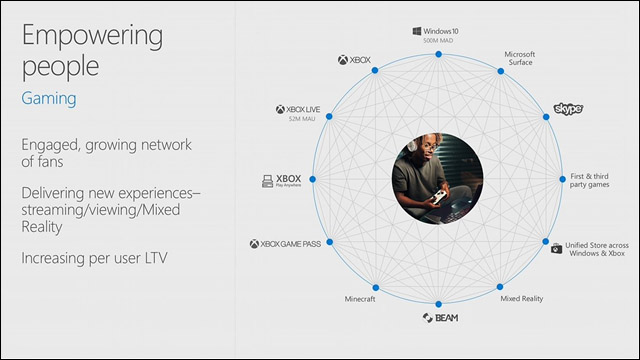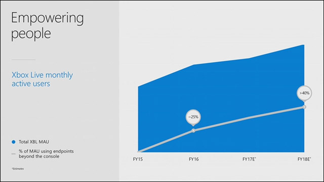 A vezérigazgató kiemelte, hogy a közvélekedéssel ellentétben ez az üzlet már korántsem csak a konzolok eladási számairól szól, sőt: az elsőszámú bevételi forrás az Xbox Live, ami a felhasználói aktivitást tekintve nem csak a világ első számú videojátékos közösségi hálója, de egyre több nyereséget is termel. A rendszer, ami korábban csak az Xbox konzolok multiplayerét hajtotta, ma már összeköti a PC-s és konzolos játékosokat, az előfizetések (Xbox Live Gold, illetve a hamarosan induló Game Pass) pedig kisebbfajta aranybányának bizonyulnak.