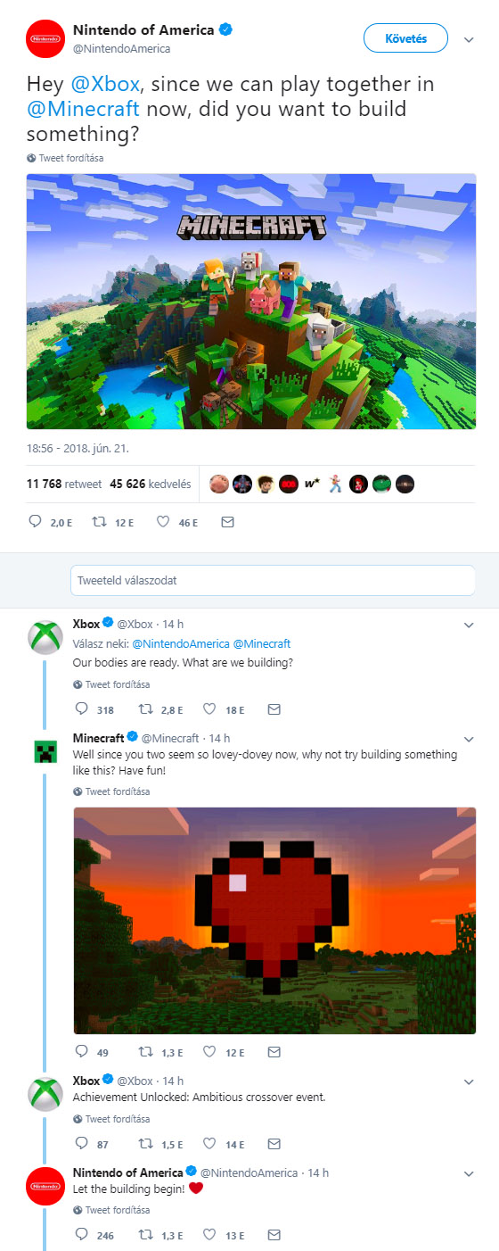 Hanem a legszebb az egészben, ahogy ezt a szép új világot a Nintendo of America és az Xbox a Twitteren meglovagolta. Érdemes az egész hozzászólás-láncot végigolvasni, a buliból a Mixer sem maradhatott ki, lévén a Minecraft az egyik legnézettebb játék.